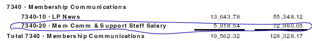 So this brings us to, perhaps, a bigger problem: even knowing this, the member reading this budget has no idea how much of staff time is spent on what projects. Perhaps most importantly, neither does the LNC. Certainly the LNC is not giving direction as to how staff time should be spent. We have, essentially, created a black box into which we place 50% of the annual budget.