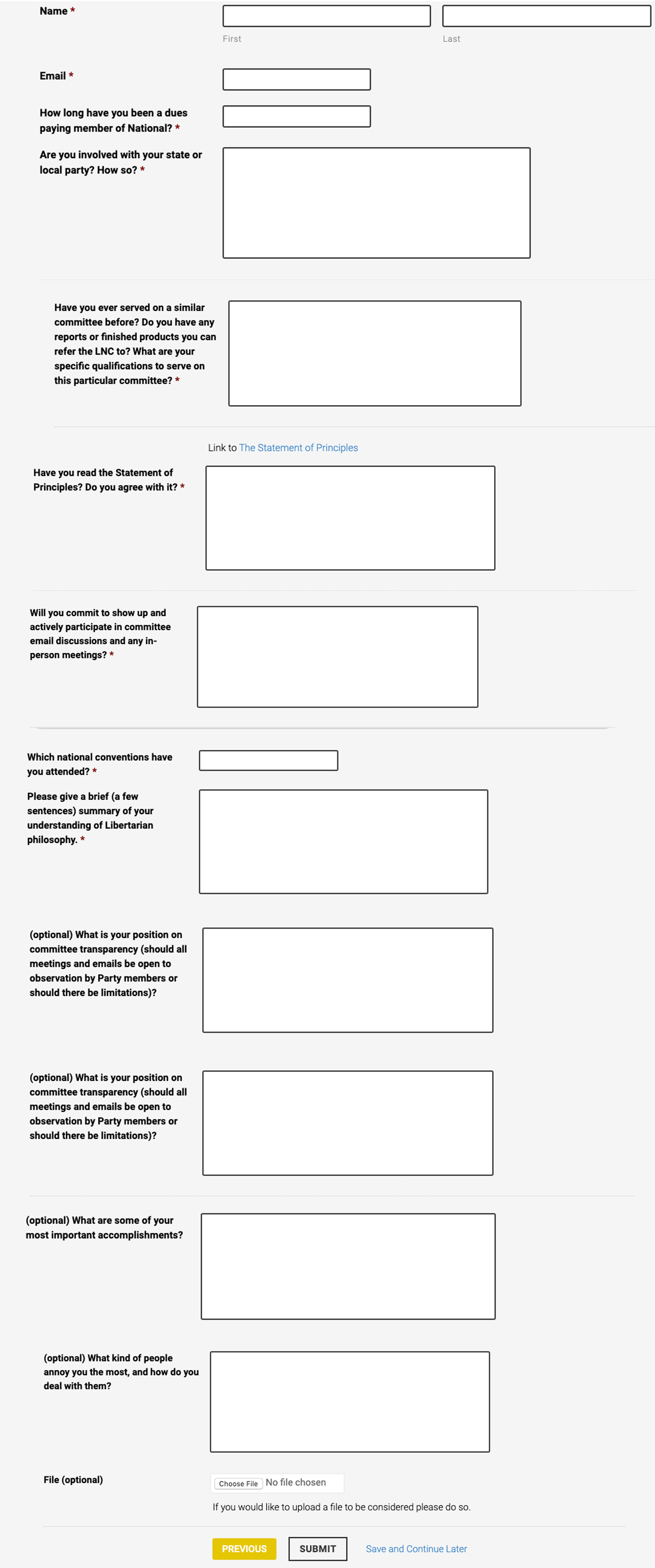 Starchild was one of the folks who could not access the application of the bylaw as it closed too early. He did notify me that day. I told him to answer the questions in a separate email which is forwarded below. He wanted the whole application forwarded on the public list. Please consider this when voting today. * In Liberty,* * Personal Note: I have what is commonly known as Asperger's Syndrome (part of the autism spectrum). This can affect inter-personal communication skills in both personal and electronic arenas. If anyone found anything offensive or overly off-putting (or some other social faux pas) in an actual email, please contact me privately and let me know. * ---------- Forwarded message --------- From: Starchild <RealReform@earthlink.net> Date: Tue, Oct 22, 2019 at 10:58 PM Subject: Re: Bylaws Committee Application To: Caryn Ann Harlos <carynannharlos@gmail.com> Cc: Starchild <RealReform@earthlink.net> Hi Caryn Ann, Here are my responses to the LP Bylaws Committee application questions (which are refreshing by the way!) *Name* Starchild *Email* starchild@lp.org *How long have you been a dues paying member of national?* Since 1992, I believe. *Are you involved with your state or local party? How so?* Very much so. I am Outreach Director for the Libertarian Party of San Francisco and a former county chair. I've run for public office five times (once for State Assembly, twice for School Board, and twice for county Supervisor). *Have you ever served on a similar committee before? Do you have any reports or finished products you can refer the LNC to? What are your specific qualifications to serve on this particular committee?* I have served on the national Platform Committee and Credentials Committee, and on the California LP Bylaws and Platform Committees. *Have you read the Statement of Principles? Do you agree with it?* Yes, I've read it and strongly agree. It is inspirational. *Will you commit to show up and actively participate in committee email discussions and any in-person meetings?* Yes. *Which national conventions have you attended?* All of them since 1992. *Please give a brief (a few sentences) summary of your understanding of Libertarian philosophy.* I believe the heart and soul of libertarianism is the Non-Aggression Principle, the idea that each person should be free to live as they choose so long as it does not involve the initiation of force or fraud against others. Individuals (not states) are sovereign, and have rights including the right to own property, the rights to freedom of speech and expression, the rights to self-defense and defense of others, the right to freedom of religion, the right to freedom of movement excluding trespassing on private property, the right to freedom of association, *(optional) What is your position on committee transparency (should all committee meetings and emails be open to Party members or should there be limitations?* I strongly support committee transparency, both in general, but for the Bylaws Committee in particular, as essential to the bottom-up governance of the Libertarian Party as a grassroots organization run by and accountable to its members. Party members not serving on a committee should be able to fully participate in all committee proceedings (both online and in-person conversations) short of making motions or voting. All committee documents and materials should be transparent to party members and accessible via the committee page on the LP.org website, along with committee members' contact information, their terms of appointment, advance notice of committee meetings, each committee member's voting history, and information on the committee. *(optional) What are some of your most important accomplishments?* Perhaps AI will be able to answer such questions in the future, but I have no idea! My most concrete or visible accomplishments (e.g. having graduated college with a degree in journalism, having been a sergeant in the U.S. government's army, beating a prostitution charge, media attention, etc.) are not necessarily the most important. The nature of my work, both as a companion and as an activist, is such that its impact can be difficult to determine. I'd like to think I have made a positive impact in people's personal lives, and for the cause of freedom, but I'll probably never have much real knowledge about the degree to which this is true. *(optional) What kind of people annoy you the most, and how do you deal with them?* Few people annoy or anger me more than petty tyrants who take perverse pleasure in enforcing authoritarian rules and regulations or simply throwing their weight around and abusing people. I generally deal with them by resistance and non-compliance to whatever extent I believe I can do so without undue risk. *File (optional)*