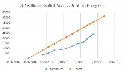 Dear All, Below is a graph that Wes Benedict prepared that shows our progress on ballot access in Illinois. There are steps being taken presently to ramp up signature gathering efforts significantly that should still have us making the 40,000 signature goal, but it's going to be a tough 10 days. If you, or anyone you know, can help in Illinois, it would be greatly appreciated at this point. more information on how to help can be found at https://lpillinois.org/petition/ Yours truly, Nick ---------- Forwarded message ---------- From: Wes Benedict <wes.benedict@lp.org> Date: Wed, Jun 15, 2016 at 2:40 PM Subject: Informing LNC about Illinois Ballot Access Progress To: Bill Redpath <william.redpath@lp.org>, Nicholas Sarwark <chair@lp.org> Nick, Perhaps the LNC should be informed about our status in Illinois. Below is a chart I made that I think accurately represents things, based on data from the Illinois spreadsheet I was given access to yesterday. I realize we have taken action to speed things up, but it's a tough week and a half ahead of us to close the gap. -- Wes Benedict, Executive Director Libertarian National Committee, Inc. 1444 Duke St., Alexandria, VA 22314(202) 333-0008 ext. 232, wes.benedict@lp.orgfacebook.com/libertarians @LPNational Join the Libertarian Party at: http://lp.org/membership