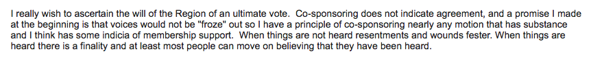 *And yes, I do think Regional Representatives (I think differently of Officers) DO have an obligation to bring forth motions asked by members (there can be some minimum bars) even if they do not support it. I will ALWAYS follow that rule and it was a promise I made to my region, and they elected me on it.*