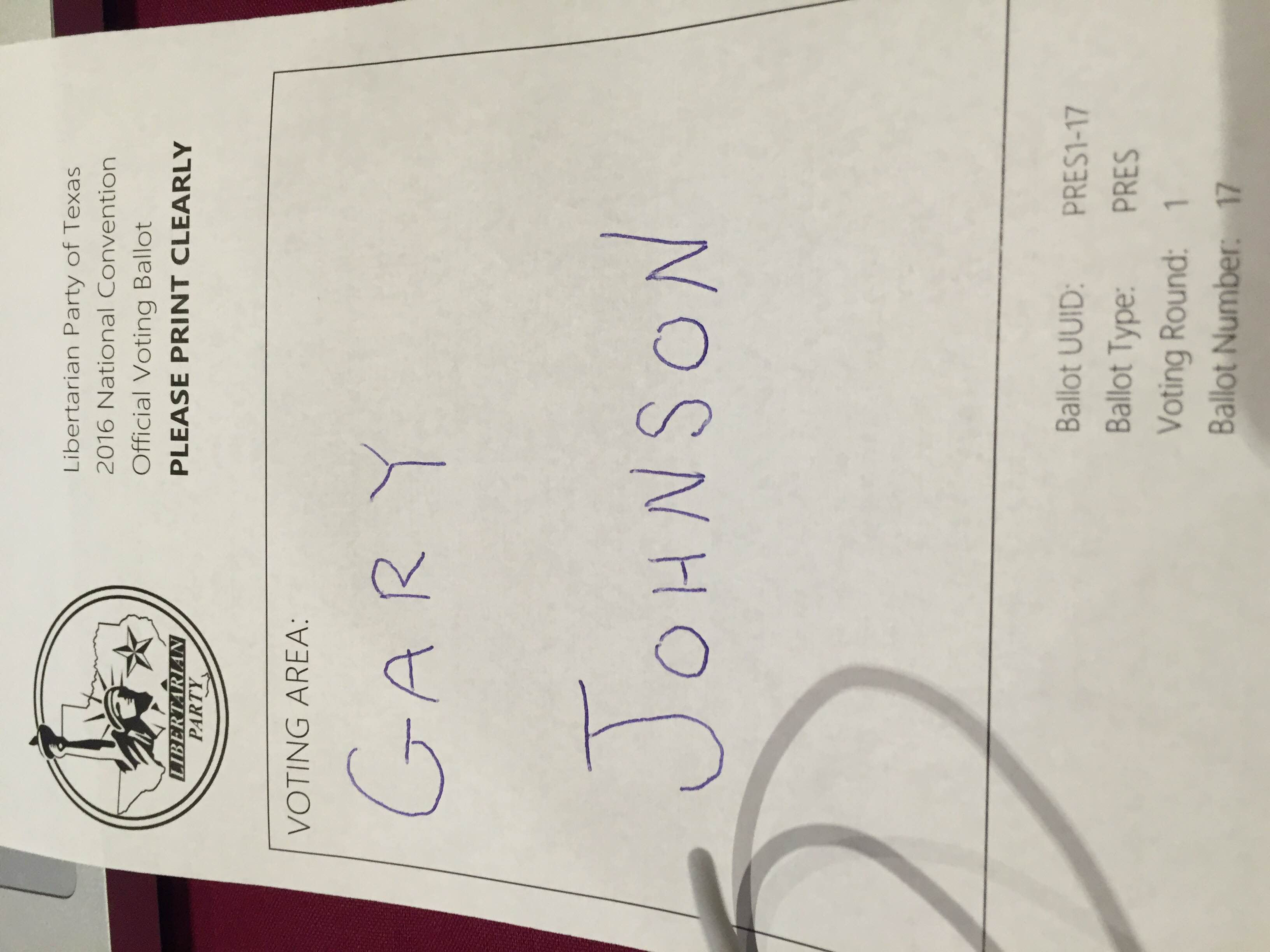 Texas preprinted paper ballots for all of the races and had them all labeled as such. Each ballot had the race, the round, and the delegate number on it (1-71 respectively). It allowed us to ensure everyone received a ballot, nobody could turn in multiple, and let us know who was outstanding. I voted for GJ and attached a picture of my ballot for you all. Note the numbering system. While I'm sure some are at odds with me for this citing state sovereignty and all of that, there's a huge practical benefit to this process being standardized by national - especially as Caryn and others have noted, voting integrity is the one of the most imperative tasks to any voting system. I 1000% support any kind of traceable electronic method and while I know it can be done, may just be too pie in the sky for the LP at this point. I think if national standardized ballots kind of like we had and passed them out to delegates (or the delegate captains or whatever) it would be a huge step in the right direction. K On Thursday, June 2, 2016, Caryn Ann Harlos <carynannharlos@gmail.com> wrote: