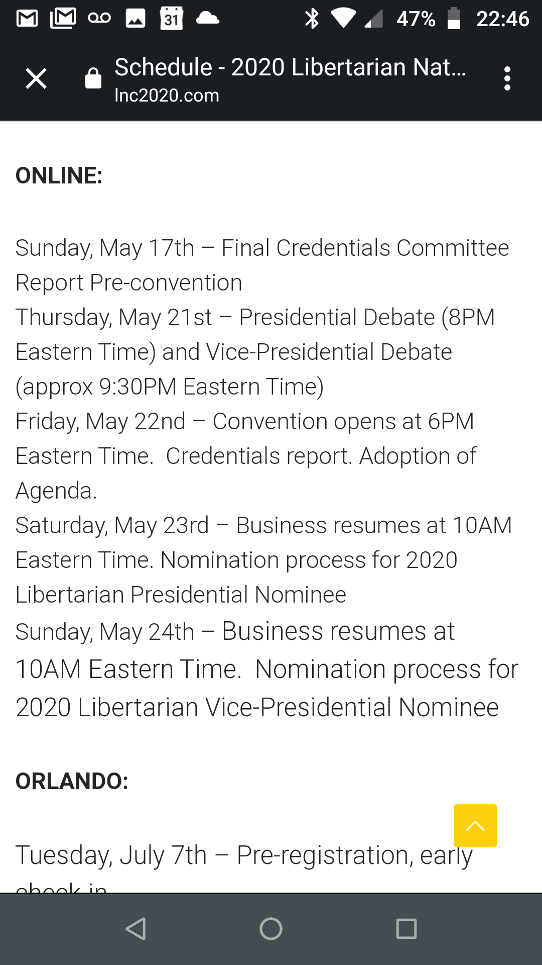 That's what I'm going to roll with unless told otherwise. Can the website please get updated. That is a big difference for my Hawaii and Alaska folk not to mention I really don't want to see a poorly attended event gavel in because half the country thought one time when it was actually another Richard Longstreth Region 1 Representative (AK, AZ, CO, HI, KS, MT, NM, OR, UT, WA, WY) Libertarian National Committee richard.longstreth@lp.org 931.538.9300 Sent from my Mobile Device On Fri, May 22, 2020, 05:46 Whitney Bilyeu <whitney.bilyeu@lp.org> wrote: