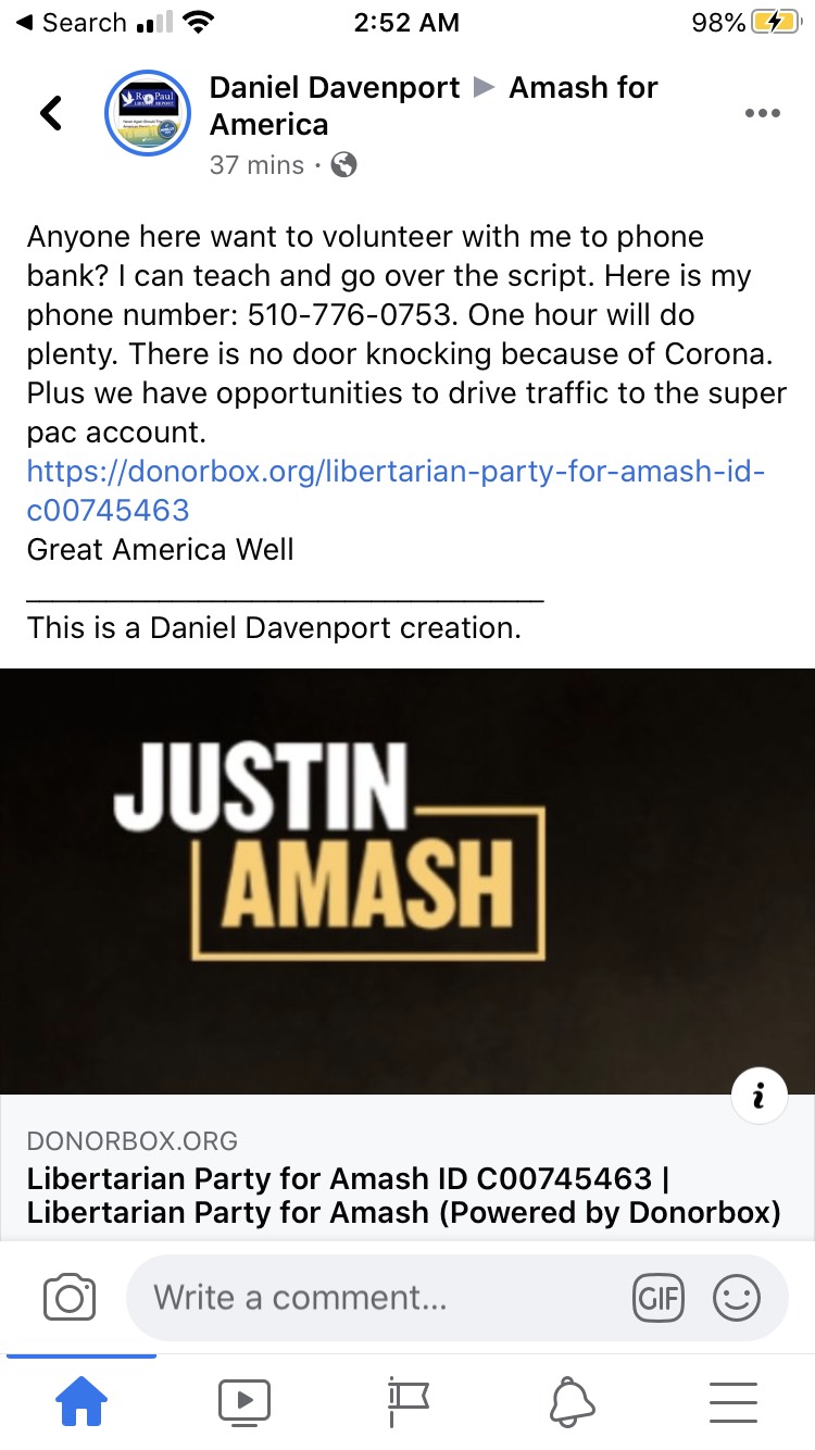 Dear Elizabeth, The Executive Director already brought it to my attention, as well as to the attention of Congressman Amash's Chief of Staff, and we have directed our counsel Oliver Hall to request that this committee fraudulently using the Libertarian Party's name without permission be taken down. With ballot access litigation and other pressing legal matters, it is not the most immediate priority, but it will be done. It would have been my hope to handle this quickly and quietly without drawing attention to it, but I do appreciate the spirit of concern and transparency in bringing it to the public discussion list. Yours in liberty, Nick On Thu, May 7, 2020 at 3:21 AM Elizabeth Van Horn <elizabeth.vanhorn@lp.org> wrote: