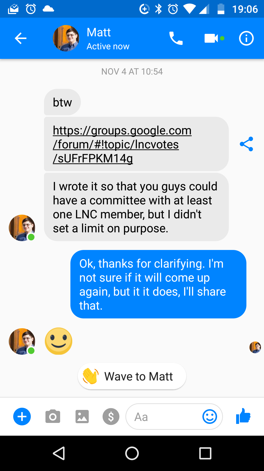 This resolves it for me. Picture attached. I also urge the committee to share when it holds meetings and strongly suggest they be public. On Fri, Nov 9, 2018, 18:41 Caryn Ann Harlos via Lnc-business < lnc-business@hq.lp.org> wrote: