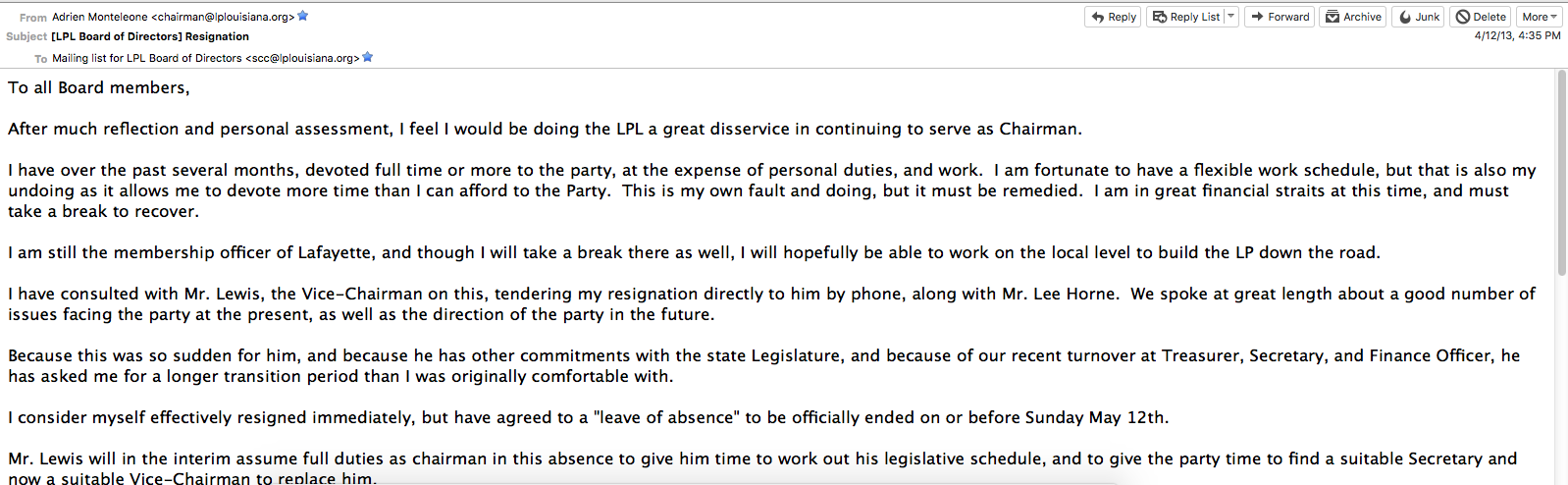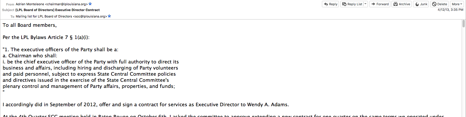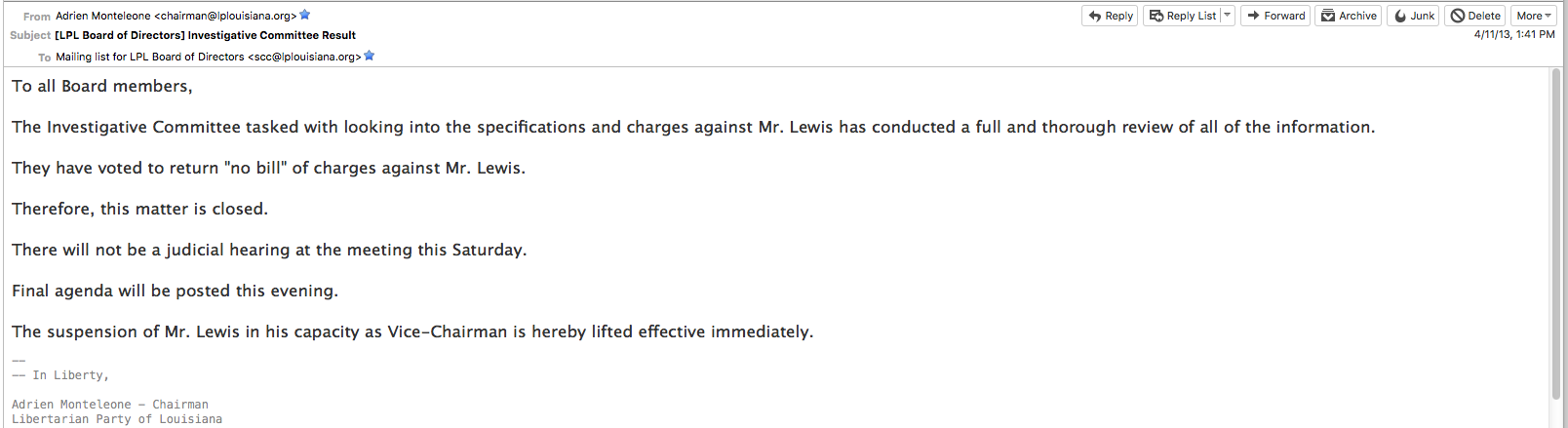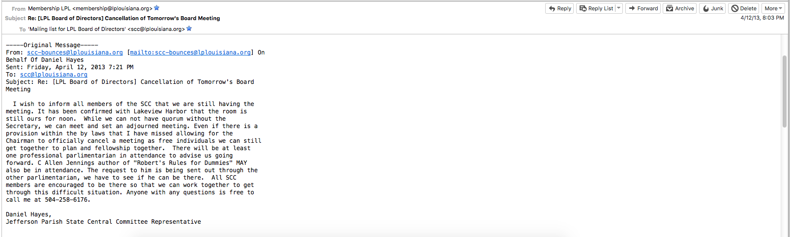 Members, Pop another bag of popcorn..this will be covering the matter regarding the letter from Mr Monteleone. Please note the dates on the screen cap I provide of his letter. Compare it to the date of the lifting of then Vice-Chairman Lewis’ suspension. Also, pay attention to the quorum requirement that the LPL was operating under at the time. "Special Rule 3.4. A quorum for any subsequent State Central Committee meeting shall be three-eighths of the actual members of the State Central Committee without regard tovacant positions, and must include either the Chairman or Vice-Chairman, and the Secretary.” Without the Secretary, the LPL was unable to have quorum. This plays a major role later in this email. I had been elected to the LPL board at a local caucus on 4/04/13 and we had a LPL SCC meeting on 4/13/13. Below there are a series of screen caps that show the chronology of events. Mr Lewis Suspension lifted. This was followed by our Secretary Mr Reed Ebarb suddenly resigning the following day. The announcement of the NOT hiring again of the wildly popular executive director. The chairman announcing the meeting cancelled and then tendering his own resignation. As Mr Ebarb and Mr Monteleone had led that witch hunt, It was clearly retaliation against the board. This was the 2nd time Mr Monteleone had resigned from a position of leadership suddenly. He had resigned after failing to get Bob Barr on the ballot in La. As to Mr. Monteleone’s claims of lack of money. I had pledged $2000 to help fund the effort and two members had pledged $1000 each, along with a lot of smaller amounts. Also note that Ms Adams was hired as an independent contractor. Mr. Monteleone was probably violating the definition of and IC by attempting to tell Ms Adams how to accomplish her job instead of simply what to accomplish as her job. When she started forming Parish Executive Committees, Ms Adams was getting much praise and I think there may have been some jealously. Either way she worked for over 2 years after this under multiple contract renewals. This is the Screen cap of the letter Mr McClendon included as “evidence” against Ms Adams showing the date it was sent to the LPL email system. We met and with the assistance of Parliamentarian Richard Brown, who I personally hired to advise me on this difficult matter(Which frankly seemed like willful sabotage by some members that did not get their way.) we had a productive meeting and appointed all the necessary officers. My apologies for this email as well. Daniel Hayes LNC At Large