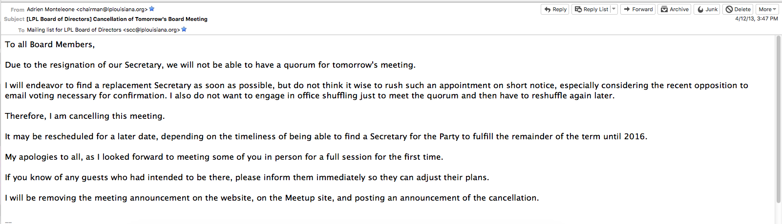 Without the Secretary, the LPL was unable to have quorum. This plays a major role later in this email. I had been elected to the LPL board at a local caucus on 4/04/13 and we had a LPL SCC meeting on 4/13/13.