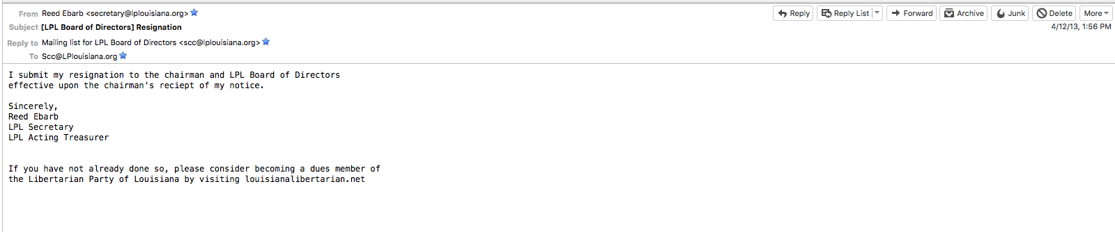 Below there are a series of screen caps that show the chronology of events. Mr Lewis Suspension lifted. This was followed by our Secretary Mr Reed Ebarb suddenly resigning the following day. The announcement of the NOT hiring again of the wildly popular executive director. The chairman announcing the meeting cancelled and then tendering his own resignation. As Mr Ebarb and Mr Monteleone had led that witch hunt, It was clearly retaliation against the board. This was the 2nd time Mr Monteleone had resigned from a position of leadership suddenly. He had resigned after failing to get Bob Barr on the ballot in La. As to Mr. Monteleone’s claims of lack of money. I had pledged $2000 to help fund the effort and two members had pledged $1000 each, along with a lot of smaller amounts. Also note that Ms Adams was hired as an independent contractor. Mr. Monteleone was probably violating the definition of and IC by attempting to tell Ms Adams how to accomplish her job instead of simply what to accomplish as her job. When she started forming Parish Executive Committees, Ms Adams was getting much praise and I think there may have been some jealously. Either way she worked for over 2 years after this under multiple contract renewals.