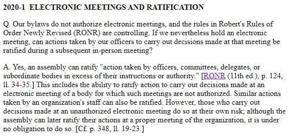 I've heard Roberts referenced a lot in terms of no electronic meetings. However, I've never seen anyone with "expert level" knowledge respond to the ratification advisory put out by the folks at Roberts and I may simply missed it. I understand what the rules are and say but everytime they are brought up, I bring up the ratifying change and all discussion on Roberts stops or the ratification argument is ignored. That's not good enough to take it off the table for me. Please explain, someone, anyone, why Roberts says electronic business can be ratified but that our parliamentarians on this committee seem convinced that the authors of Roberts are wrong. Even in talking with others around the party, inxlluding those in favor of poI want to understand why and how the authors are wrong a little better and am not trying to be a thorn or argumentative. For reference, I've attached a screenshot of the decision which seems to indicate electronic meeting is ok with ratification this meaning an electronic setting would be acceptable. Someone please answer this directly and leave any other convoluted argument out. This is a very specific question. Richard Longstreth Region 1 Representative (AK, AZ, CO, HI, KS, MT, NM, OR, UT, WA, WY) Libertarian National Committee richard.longstreth@lp.org 931.538.9300 Sent from my Mobile Device On Fri, May 8, 2020, 00:45 Caryn Ann Harlos via Lnc-business < lnc-business@hq.lp.org> wrote: